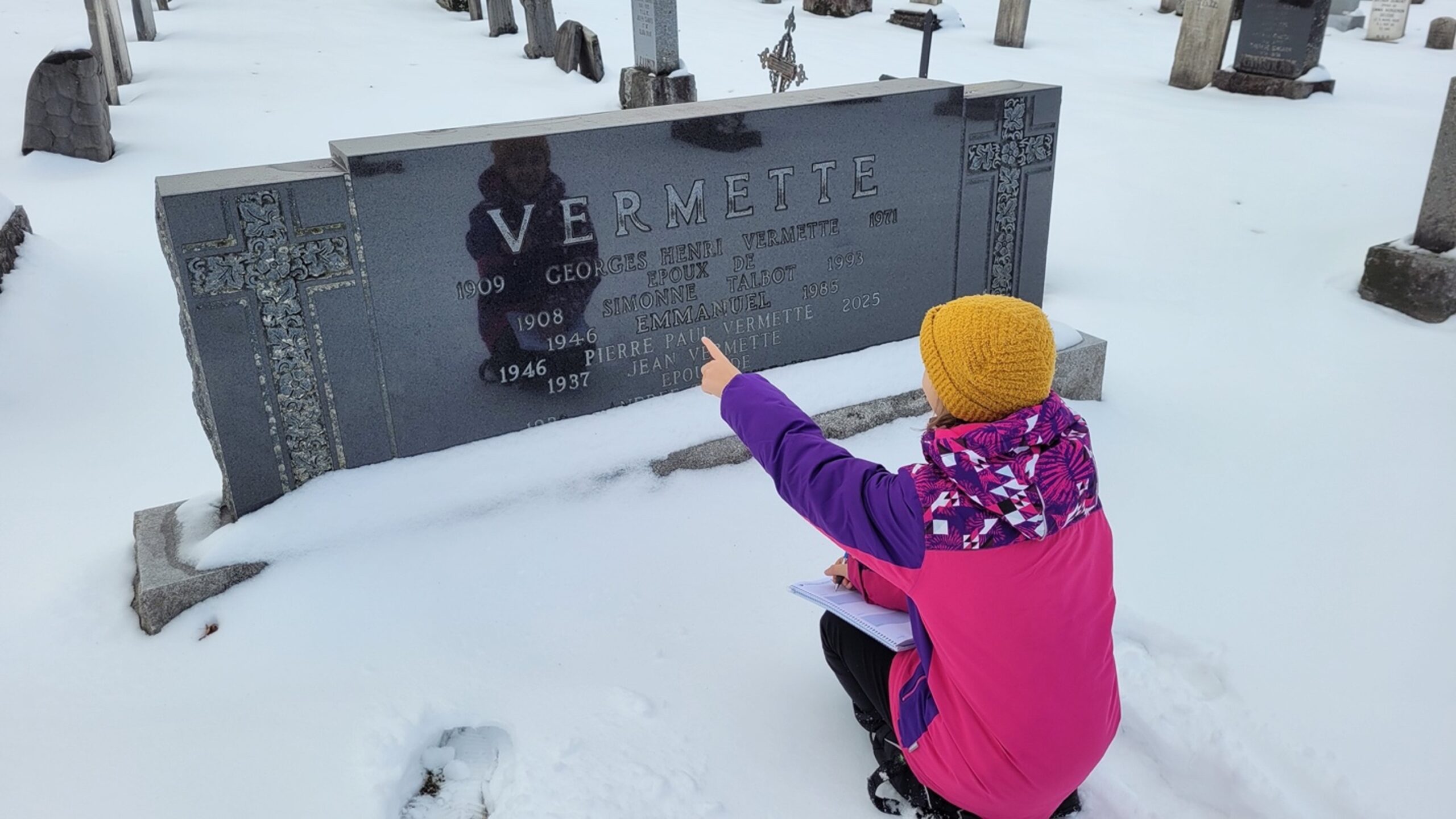 Le 11 novembre dernier, pour le jour du Souvenir, c’est environ 125 élèves de 5e et 6e année de l’école primaire de l’Épervière qui se promenaient entre les stèles du cimetière de Saint-Agapit, dans mon petit coin de campagne. Armés d’un crayon et d’une planchette à pince, les petits groupes de jeunes arpentaient les avenues de pierres tombales, tantôt s’accroupissant, tantôt balayant délicatement la nouvelle neige accumulée sur les monuments pour mieux en déchiffrer les inscriptions érodées par les années. Leur but ? Retrouver les informations et les défunts se trouvant sur la feuille préparée par moi, présidente de Pierres mémorables, et leur super guide d’un jour.